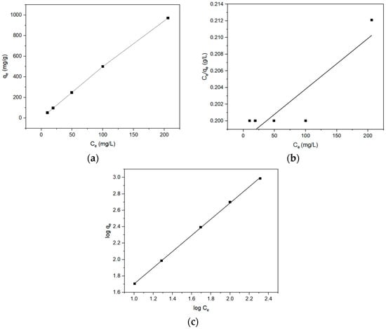 The effect of initial concentration on the adsorption efficiency of PAN-NA was studied in the range of 10–200 mg/L. As shown in Figure 9a, the adsorption capacity of PAN-NA increased with an increase in the amount of Pb(II) cations in the solution to reach a maximum value of qe = 970.75 mg/g at 200 mg/L. As we are interested in studying the adsorption capacity of PAN-NA at low concentrations, we choose the 20 mg/L for optimum adsorption conditions. Two isotherm models (Langmuir and Freundlich) were applied to the experimental data to understand the adsorption mechanism of Pb(II) on the polymer surface. The Langmuir isotherm model describes the monolayered adsorption on a homogenous surface [36]. The linear equation of the Langmuir model is used here as follows: