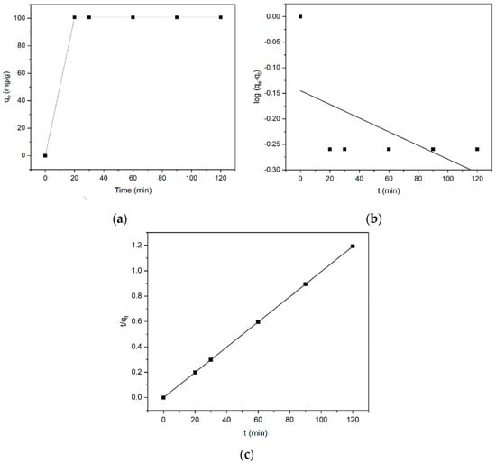 The rate of the adsorption process is a crucial variable when selecting an adsorbent. The kinetics of Pb(II) adsorption on PAN-NA were studied over a time of 20–120 min. Figure 10a depicts the impact of contact time on Pb(II) adsorption capacity. The Pb(II) uptake reaches equilibrium within the first 20 min, suggesting the rapid Pb(II) adsorption efficiency of the PAN-NA polymer. Pseudo-1st-order and pseudo-2nd-order kinetic models were used to evaluate the experimental data (Figure 10b,c). Both kinetic models were applied using the following equations:
