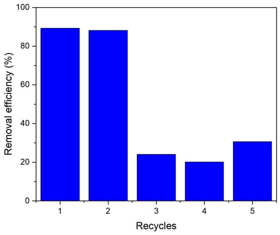 Adsorbent recycling for repeated applications is critical for achieving the most cost-effective treatment method [34]. As presented in Figure 11, after conducting the adsorption and desorption processes five times, we found that the polymer can be reused a maximum of two times without losing its efficiency. The adsorption capacities after two recycling runs at optimum conditions were 90.36% and 88.17%, respectively.