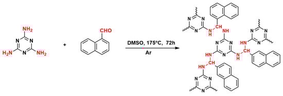 A dry three-necked flask equipped with a magnetic stirrer and condenser was first evacuated with a vacuum and then degassed with an evacuation–argon-backfill cycle. Then, 0.5 g (3.96 mmol) of melamine and 0.69 mL (7.16 mmol) of α-naphthaldehyde were added to 25 mL of DMSO and heated to 175 °C for three days. Finally, the mixture was cooled down to room temperature and the product was collected by filtration and washed consecutively with additional methanol, THF, and dichloromethane to afford a yield of 85%.