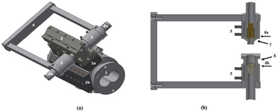 (a) Experimental set-up: modified barrel segment (1) with two axial rows of sampling devices (2a, 2b); multi-slit die (3); sliding optical detector with a C-shaped support (4); water-cooling system (5); light source (6a) and receptor (6b) for optical measurements and (b) Optical detector system: LED (6a) with a polarizer (7) and two LDRs (6b) with a polarizing filter (8).