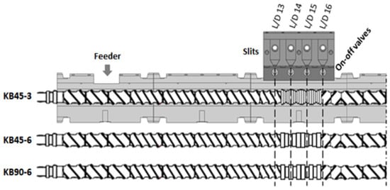 Screw profiles containing a 60 mm long mixing zone with different geometries: KB45-3—four kneading blocks with positive 45° stagger, each containing five 3 mm thick disks; KB45-6—two kneading blocks with 45° positive stagger, each containing five 6 mm thick disks; KB90-6—two kneading blocks with neutral 90° stagger, each containing five 6 mm thick disks.
