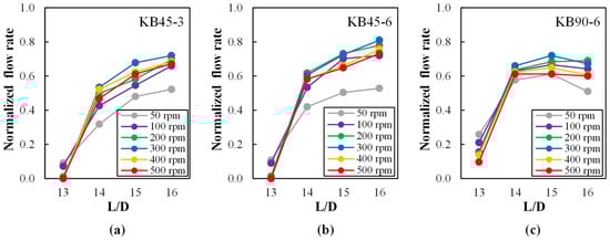 Normalized flow rate at ports L/D = 13, 14, 15, and 16 along the mixing zone as a function of screw speed (50 to 500 rpm) for each kneading block: (a) KB45-3, (b) KB45-6 and (c) KB90-6. The normalized flow rate is a direct indication of the local pressure inside the screw channel.
