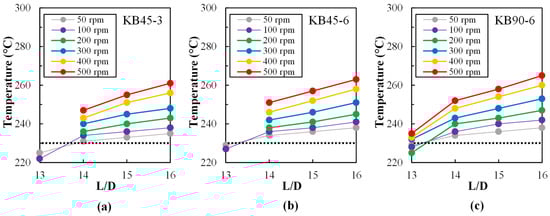 Melt flow temperature (°C) along the mixing zone for various screw speeds (50 to 500 rpm) for each kneading block: (a) KB45-3, (b) KB45-6, and (c) KB90-6. The set extrusion temperature (230 °C) is represented by a horizontal dashed line in each chart.