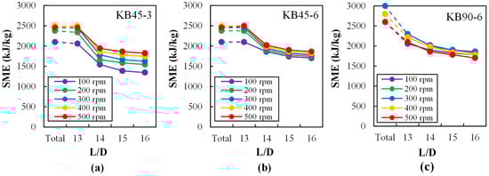 Specific mechanical energy SME (kJ/kg) at ports L/D = 13, 14, 15, and 16 along the mixing zone as a function of screw speed (50 to 500 rpm) for each kneading block: (a) KB45-3, (b) KB45-6, and (c) KB90-6. “Total” denotes SME values without any material sampling.
