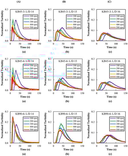The RTD curves obtained by following melt flow turbidity were measured between L/D = 14 and 16, for the three screw profiles and screw speeds ranging from 100 to 500 rpm, with the barrel set to 230 °C. These curves are shown in Figure 6. Curves were also obtained for two other barrel set temperatures (220 °C and 240 °C, not shown), revealing the same pattern. All the curves exhibit the typical pulse shape, becoming broader and being shifted to longer times as they are obtained more downstream. Differently, increasing screw speeds shifts the curves to shorter times while widening them. These results were to be expected, as they reflect the typical progression of the material along the screws of a co-rotating twin screw extruder with a corresponding enhancement of mixing [,].