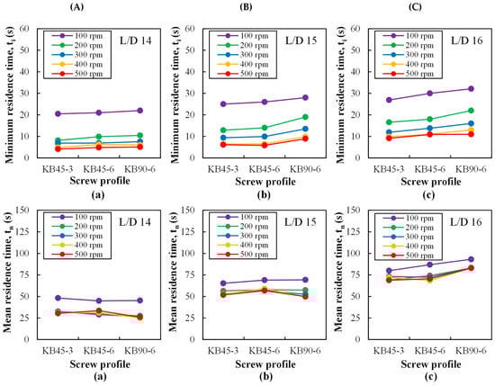 Minimum (ti) and mean (tn) residence times (s) measured with the barrel set to 230 °C along the mixing zone at ports: (a) L/D = 14, (b) L/D = 15, and (c) L/D = 16 for different kneading blocks (A: KB45-3, B: KB45-6, and C: KB90-6) and screw speeds (100 to 500 rpm).