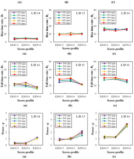Rise (R1) and fall (R2) time rates and power exponent (p) parameters of the fitted pulse curve to the RTD curves measured with the barrel set to 230 °C along the mixing zone at ports: (a) L/D = 14, (b) L/D = 15, and (c) L/D = 16 for different kneading blocks (A: KB45-3, B: KB45-6, and C: KB90-6) and various screw speeds (100 to 500 rpm).