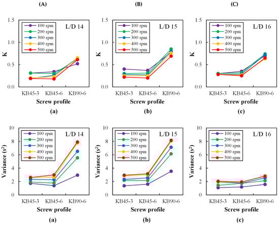 Area constant (K) and variance () based on RTD curves measured with the barrel set to 230 °C along the mixing zone at ports: (a) L/D = 14, (b) L/D = 15, and (c) L/D = 16 for different kneading blocks (A: KB45-3, B: KB45-6, and C: KB90-6) and various screw speeds (100 to 500 rpm).