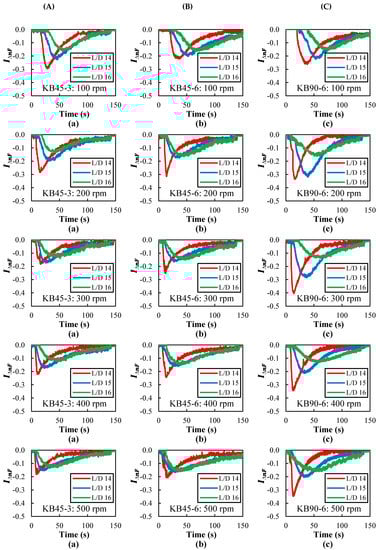 Residence time distribution (RTD) curves measured with the barrel set to 230 °C along the mixing zone at ports: (a) L/D = 14, (b) L/D = 15, and (c) L/D = 16 for different kneading blocks (A: KB45-3, B: KB45-6, and C: KB90-6) as a function of screw speed (100 to 500 rpm). The time scale was shortened to 150 s to better show the major peak area.