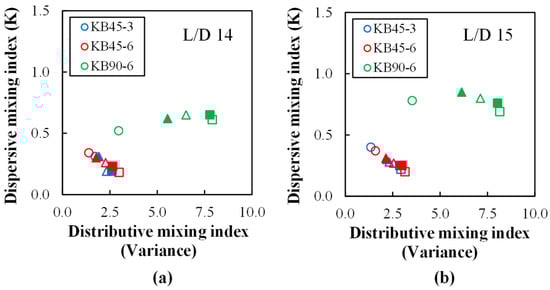 Mapping the mixing performance: dispersive mixing index (K) versus distributive mixing index () for different kneading blocks (KB45-3, KB45-6, and KB90-6) and screw speeds (○—100 rpm, ▲—200 rpm, ∆—300 rpm, ■—400 rpm, and □—500 rpm) at ports: (a) L/D = 14 and (b) L/D = 15.