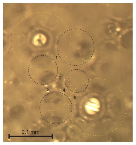 Thin slices of foams were cut with a razor blade, with a thickness 0.10 mm, from three mutually perpendicular sides of each microscopy sample and fixed on a glass slide, marking the rise direction. The slices were cut as (a) parallelepipeds and (b) narrow-angled wedges. A light microscope Diamond MCXMP500, MICROS Produktions-&Handels GmbH, Austria, with processing software and calibration reticle was used for the investigation of the PU foams’ structure at magnification of 10×. Light microscopy of the seven samples of M1 showed an influence of the gas-release hole in the mode of (1) a skewed, untypical structural anisotropy due to a directed flow of escaping bubbles and (2) the presence of singular, untypically large bubbles. Therefore, the M1 samples were omitted and only the seven M2 samples, situated comparatively far from the gas-release hole, were further used for microscopy. More details of the methodology are given in the