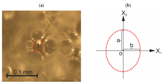 Un-foamed polymeric elements of irregular shape that exceed the average dimensions of (a) walls on the cutting surface images or (b) nodes on the through-cutting surface images several times are regarded as un-foamed volumes and are modelled as ellipsoids with semi-axes a, b, and c, as shown in