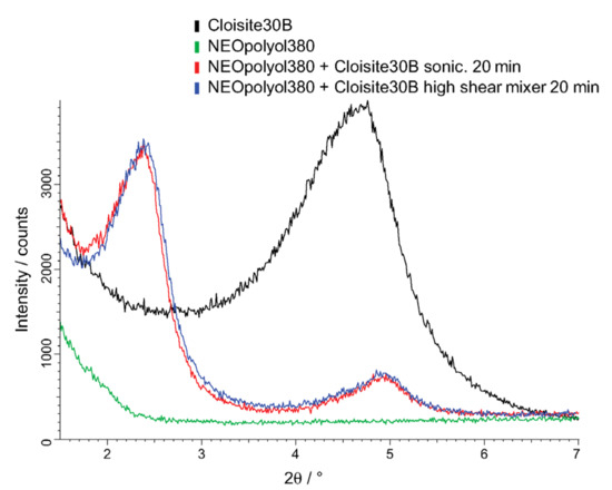 Intercalation and exfoliation of Cloisite-30B mono-layers was evaluated via the basal spacing by X-ray diffraction (XRD) at a 5 wt.% concentration of nanoclay in dispersions made by (a) high shear mixing, with an effective mixing time of 20 min, and (b) sonication, with an effective sonication time of 20 min. The XRD patterns of clay-polyol dispersions were obtained by a Bruker D8 Discover diffractometer (Bruker AXS GmbH, Karlsruhe, Germany), equipped with a LynxEye detector employed at a 0D mode, using copper radiation (CuKα) at a λ = 0.15418 nm wavelength. The diffractometer’s tube voltage and current were set to 40 kV and 40 mA, respectively. The divergence slit was 0.2 mm, and the anti-scattering slit was 8.0 mm. The samples were spilled into sample holders and rotated during the measurements. XRD patterns were registered at a scan speed of 10 s/0.01° from 1.5° to 7° in the 2θ scale.