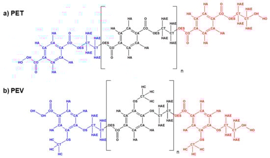 The atom types assigned for the two single-chain polymers: (a) PET and (b) PEV. The head, middle and tail of structures were represented in blue, black and red, respectively.