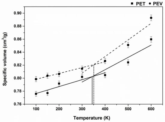 Temperature dependence of the specific volume for PET (■, solid line) and PEV (●, dashed line). The intersection of the two trended lines defined the glass transition temperature (Tg) of the polymer.