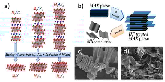 - Naguib, M.; Mochalin, V.N.; Barsoum, M.W.; Gogotsi, Y. 25th Anniversary Article: MXenes: A New Family of Two-Dimensional Materials. Adv. Mater. 2014, 26, 992–1005. [Google Scholar] [CrossRef] [PubMed]