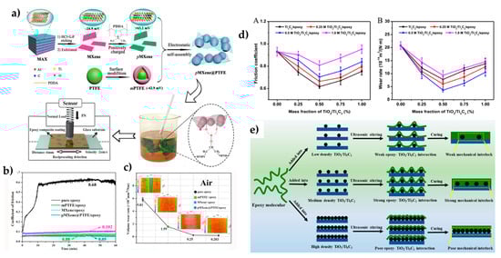 (a) Schematic illustrating of fabrication for MXene@PTFE hybrid, preparation process, and friction test of epoxy composite coating. Reproduced with permission from Ref. [67]. Copyright 2021 Elsevier; (b) COF curves and (c) volume wear rates (W) of pure epoxy, PTFE/epoxy, MXene/epoxy, and MXene@PTFE/epoxy composite coatings under humid conditions (RH: ~80%). Reproduced with permission from Ref. [67]. Copyright 2021 Elsevier; (d) Friction coefficient (A) and wear rate (B) of TiO2/Ti3C2/epoxy nanocomposites with different mass frictions under a normal load of 8 N. Reproduced with permission from Ref. [61]. Copyright 2021 MDPI. (e) Model of the interaction between TiO2/Ti3C2 and epoxy matrix in TiO2/Ti3C2/ER nanocomposites. Reproduced with permission from Ref. [61]. Copyright 2021 MDPI.