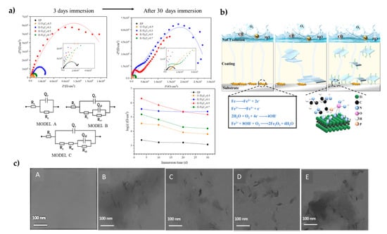 (a) Nyquist plots with different immersion times (3 and 30 days) and impedance moduli of neat ER and (GPS)-Ti3C2TX coatings. Common equivalent circuits to fit EIS data. Model A [Rs(QcRc)] is the equivalent electrical circuit appropriate for describing the initial stage of immersion, and as the immersion time increased, the equivalent circuit is described by Model B [Rs(QcRc(QdlRct), where corrosion gradually penetrates into the epoxy coating, reaching the coating/metal interface. In Model C, the Warburg resistance (Rw) was included because of the tangential diffusion effect due to lamellar nanofiller addition. Reprinted with permission from Ref. [83]. Copyright 2022 Elsevier; (b) Schematic representation of corrosion process of neat epoxy, 0.2 wt % MXene, and 0.2 wt % functionalized MXene coating. Reprinted with permission from Ref. [92]. Copyright 2022 Springer Nature Switzerland; (c) TEM images of ultrathin section (A–E) showing neat ER, unmodified-Ti3C2Tx-0.5, and epoxy functionalized-Ti3C2Tx, epoxy coatings. Reprinted with permission from Ref. [83]. Copyright 2022 Elsevier.