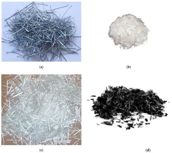 Different fibres: (a) Steel fibres; (b) Polypropylene fibres; (c) Glass fibres; (d) Carbon fibres.