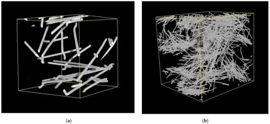 Fibre in concrete improves the concrete’s tensile strength. It reduces the intrinsic porosity of gel by reducing air and water gaps. It boosts the concrete’s durability. Most resins do not have the same creep resistance as fibres such as graphite and glass [12]. As a result, the volume fraction and orientation of the fibres has a major impact on the creep behaviour of tendons/reinforcement bars though the distribution, orientation, and segregation of fibres all of which are influenced by the mixing, casting, and vibration methods utilised [13]. Some important techniques were applied to measure the amount of steel fibres in concrete specimens using an X-CT, showing the strong influence of the volume fraction of steel fibres on the different technical properties of steel reinforced concretes. Figure 2 shows comparative images of the distribution of steel fibres in two different specimens with 40 mm × 40 mm × 40 mm dimensions [14].