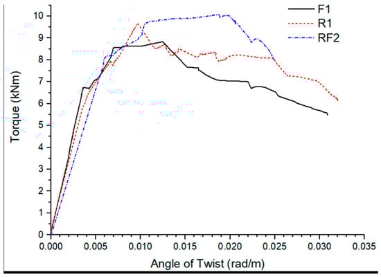 Similarly, in a study carried out by Chalioris [62], the torsional performance of externally reinforced beams was found to be superior to that of the non-strengthened control specimens. For FRP strips-wrapped beams, failure was a little more delayed than for control specimens, which had already begun to rupture. The unwrapped concrete of the beams, on the other hand, gradually developed torsional diagonal fissures that became wider. A typical experimental curve for an RC beam with FRP strips revealed two separate zones. The varied characteristics of the reaction in these locations indicate the varying nature of the load resisting system in each segment. In general, this suggests that for existing under-reinforced beams exposed to torsion, epoxy-bonded FRP strips may be used to enhance the structure.
