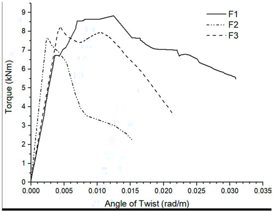 Torque vs. angle of twist for beam samples formed only with fibre reinforcement [39].