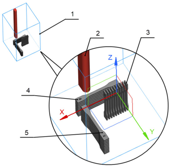 Part orientation and position in the 3D printer chamber; 1—Build Chamber EOS P396, 2—No Build Zone (red line), 3—Samples G1 (10 pcs), 4—Samples B1 (10 pcs), 5—Samples A1 (10 pcs).