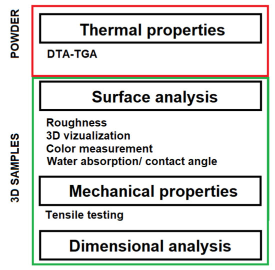 A summary of the analysis carried out for the powder and 3D samples can be seen in Figure 2.