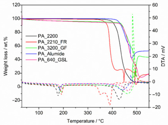The results show the effect of additives on the specified melting temperature; after adding additives, it increased by about 8 °C. Furthermore, the samples were also characterized in terms of Tmax. Most of the samples containing additives showed higher heat resistance when compared to pure PA_2200. Only the sample PA_2210_FR, which contained flame retardant, showed a lower Tmax than the PA_2200. The courses of thermal behavior can be seen in Figure 3. The content of additives in the polymer matrix has a great influence on Tmax (it is a thermal characteristic about the temperature at which the sample loses its maximum weight), and since it is different, it is difficult to draw closer conclusions. A lot depends on the type of aid related to the possibility of applying different maximum amounts. However, from the application’s point of view, it is certainly important to know the processed materials in terms of their thermal properties. Another important characteristic in terms of thermal parameters is determining the so-called sintering window, which is the temperature interval between melting and crystallization onset points. As the DTA-TGA technique is not as sensitive as a differential scanning calorimetry (DSC), in our case, it was not possible to determine this important parameter in terms of LPBF technology. This parameter can be used, for example, to monitor the reuse of materials [38].