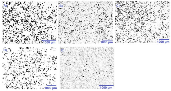 Images from powders observed by confocal microscopy Keyence VHX 6000, (A)—PA_2200, (B)—PA_2210_FR, (C)—PA_3200_GF, (D)—PA_Alumide, (E)—PA_640_GSL.
