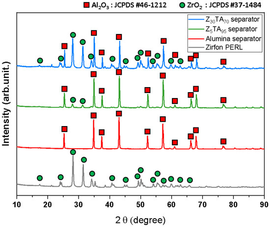 Figure 1 shows the X-ray diffraction analyses of commercial Zirfon® and the prepared separator membranes, which were carried out to confirm the crystal structure. The presence of the monoclinic zirconia phase in Zirfon® was confirmed by the standard card of JCPDS #37-1484 [71]. The alumina separator exhibited a hexagonal structure by JCPDS #46-1212 [72]. In the Z5TA95 and Z30TA70 separator membranes (zirconia nanoparticles in alumina matrix), the presence of large hexagonal phase and smaller monoclinic phases was confirmed by JCPDS #46-1212 and JCPDS #37-1484, respectively.