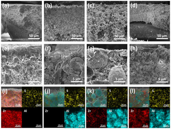 Cross-sectional SEM images, low-magnification (a) Zirfon®, (b) alumina separator membrane, (c) Z5TA95 separator membrane, and (d) Z30TA70 separator membrane and higher-magnification (e) Zirfon®, (f) alumina separator membrane, (g) Z5TA95 separator membrane, and (h) Z30TA70 separator membrane. SEM-EDS elemental mapping analysis of (i) Zirfon®, (j) alumina separator membrane, (k) Z5TA95 separator membrane, and (l) Z30TA70 separator membrane.