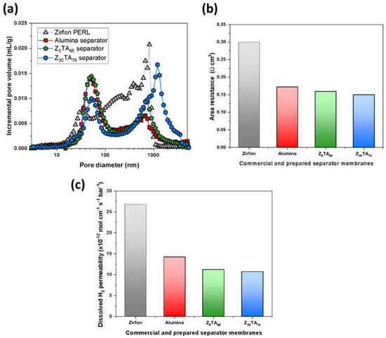 Figure 3a shows the mercury pore size distribution of ZTA separator membranes and reference Zirfon®. Separator membranes are largely comprised of nanometer-size interconnected ZTA pores. Small pores of 10 to 50 nm represent the pores between the ZTA nanoparticles and relatively larger, macro-sized pores of are correlated with the interconnected polysulfone pore network. Zirfon® gave an initial broad peak within the range of 10–50 nm and a second narrow and large peak having strong intensity at around 1000 nm pore size. However, the ZTA-based separator membranes displayed a reduction in the micro-sized type pores with a decrease in the intensity as well. The first peak intensity of the alumina and Z5TA95 separator membranes (at around 70 nm) was greater than that of the Z30TA70 separator membrane, which indicates that alumina and Z5TA95 have a smaller average pore size as compared to Z30TA70. However, the prepared separators exhibited a wide distribution of pores from 50 to 100 nm and demonstrated higher-intensity values as compared to Zirfon®. The Z30TA70 exhibits the second peak of large intensity at greater than 1000 nm. The physical characteristics of the separator membranes and Zirfon® are summarized in Table 2. The largest pore size (~125.10 nm) was observed in the Z30TA70 separator membrane. The reference Zirfon® represented the average pore size value (~99 nm), which was lower than that of Z30TA70. The alumina separator membrane had the smallest average pore size value (~79.63 nm). It was noted that the ZTA separator membranes exhibited a wider pore distribution from 50 to 100 nm, which is related to the peak shift onto the left side toward the smaller pore diameters in comparison with the reference Zirfon® (Figure 3a). The alumina separator membrane having a spherical pore shape exhibited a large pore area (16.39 m2 g−1) (Table 2), in comparison to the Z30TA70 membranes, which showed a 13.65 m2 g−1 pore area. Z30TA70 with a large average pore diameter exhibited uniform pore distribution throughout the structure as shown in Figure 2h.
