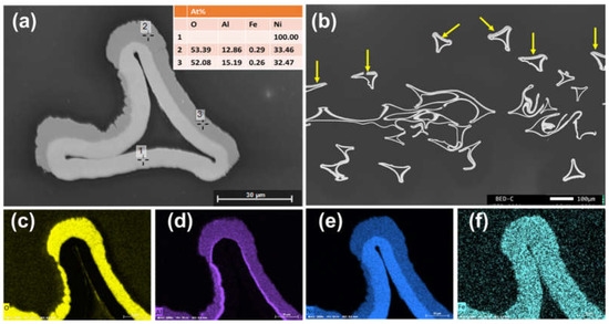 Cross-sectional SEM images of Raney-Ni electrode in the as-leached state (a,b) and elemental mapping images for (c) oxygen, (d) aluminum, (e) nickel, and (f) iron.
