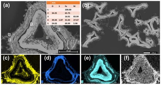 Cross-sectional SEM images of Ni-Fe electrode in the as-prepared state (a,b) and elemental mapping images for (c) oxygen, (d) nickel, (e) iron, and (f) sulfur.