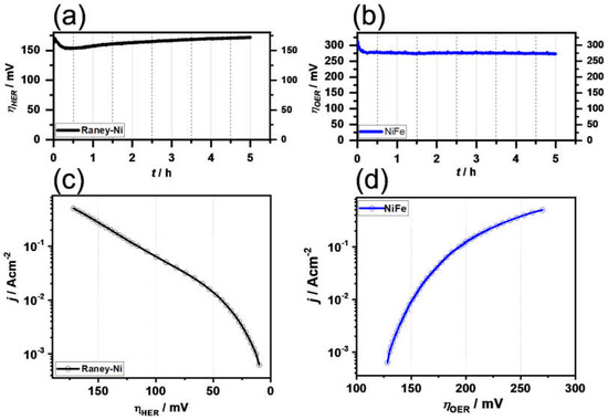 The samples were electrochemically investigated using the test protocol given in Section 2.5. The results in Figure 6 reveal that the Raney-Ni-coated foam exhibited an overpotential after 5 h of η500 = 174 mV. A slight increase of potential was detectable (~+5 mV/h).