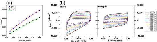 Galvanostatic curves for (a) plot of the average current density at 0.4 V (vs RHE) vs the scan rate (extracted from (b)) and CVs for Ni-Fe and Raney Ni electrodes at different scan rates.