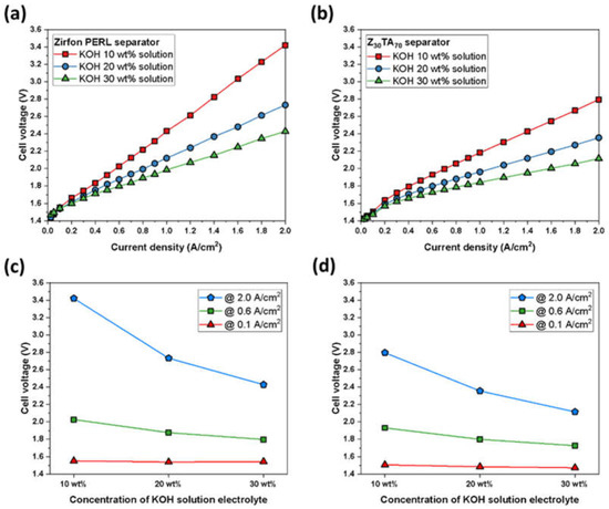 The low performance of Zirfon® in comparison to Z30TA70 was due to the random distribution of zirconia nanoparticles in polymer matrix (Figure 2e), and the higher ohmic resistance 0.3 Ω·cm2. Z30TA70 exhibited reduced performance in 20 wt.% and 10 wt.% KOH (Figure 9b); however, it was still much better than Zirfon®. The effect of KOH concentration on cell voltage at different current densities was also analyzed (Figure 9c,d). There was no change in the performance of Z30TA70 and Zirfon® at various KOH concentrations at a low current density of 0.1 A/cm2 (Figure 9c,d). On the contrary, at a higher current density of 2 A/cm2, the performances of both Z30TA70 and Zirfon® were enhanced by increasing the KOH concentration from 10 to 30 wt.%. Zirfon® exhibited a high cell voltage of 3.6 V at a high current density of 2 A/cm2 owing to the use of diluted aqueous KOH solution of 10 wt.%. It is well known that ionic conductivity values decrease with lower KOH concentration, which implies that the internal resistance of Zirfon® is relatively higher than that of our prepared membranes.