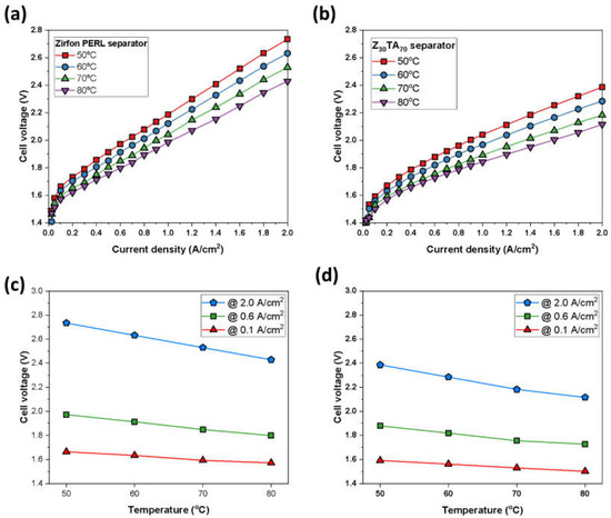 Zirfon® also showed reduced performance at lower temperatures and exhibited improved performance at 80 °C (Figure 10a); still, it showed lower performance than Z30TA70 (Figure 10a,b). The effect of temperature on cell voltage at different current densities was also analyzed (Figure 10c,d). At a higher current density of 2 A/cm2, the performances of both Z30TA70 and Zirfon® were enhanced by increasing the temperature to 80 °C (Figure 10c,d). The reason is that, at high temperatures, the viscosity of the KOH solution decreases, which increases the flow of KOH.