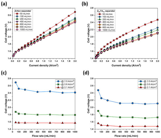 The polarization characteristics of Z30TA70 were also examined by varying the KOH circulation rate. By increasing the circulation rate of KOH, the performance of Z30TA70 also improved. Z30TA70 demonstrated 2 A/cm2 at 2.45 V at 50 mL/min KOH flow rate. On increasing the flow rate to 800 mL/min, Z30TA70 exhibited improved performance of 2 A/cm2 at 2.1 V due to an increase in KOH flow through the separator membrane (Figure 11b). For comparison, Zirfon® showed reduced performance as compared to Z30TA70 at different flow rates due to its higher ohmic resistance and gas permeability (Figure 11a). The effect of the circulation rate of KOH on cell voltage at different current densities was also analyzed (Figure 11c,d). At a higher current density of 2 A/cm2, the performances of both Z30TA70 and Zirfon® were enhanced by increasing the KOH circulation rate. This was mainly due to the rapid flow of KOH through the separator membrane. However, Z30TA70 exhibited much better performance than Zirfon® (Figure 11c,d).