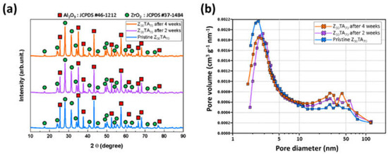 To investigate the performance of Z30TA70, a stability test was performed in harsh conditions. Z30TA70 was immersed in 35 wt.% aqueous solutions of KOH at 100 °C for four weeks. The stability was checked after two weeks and four weeks by conducting XRD and BET analysis, as shown in Figure 12.