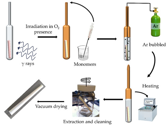 SBMA grafting was performed on PVC-g-4VP catheters using the oxidative pre-irradiation method. For the synthesis, dry PVC-g-4VP catheters were weighed and placed in glass ampoules, which were then irradiated in the presence of air. A SMBA solution in MeOH: H2O was added to the irradiated samples, the oxygen in the solution was removed by air displacement with argon bubbling for 10 min, and then the ampoules were sealed and kept at 5 °C for 4 h to then heat in a water bath. Finally, the samples were removed from the ampoules and washed, once with a saturated NaCl solution for 2 h, twice with distilled water for 3 h, and once with ethanol; after which they dried under vacuum oven for 12 h at 30 °C, and the percentage of grafting was calculated following Equation (1). Figure 1 shows the procedure.