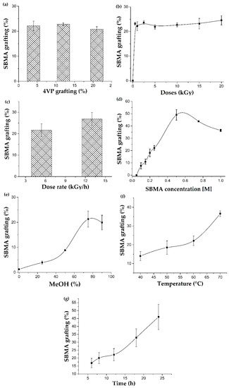 The effect of the different reaction conditions on the SBMA graft percentage was studied, for which the conditions were varied: the 4VP percentage grafted (4, 12, and 21%), doses (1, 2, 5, 10, 15, and 20 kGy), dose rate (5.4 and 13 kGy/h), SBMA concentration (0.05, 0.1, 0.15, 0.2, 0.25, 0.5, 0.75, and 1 M), MeOH percentage in the MeOH:H2O mix used as dissolvent (0, 25, 50, 75, and 90%), reaction temperature (40, 50, 60, and 70 °C), and reaction time (6, 8, 12, 18, and 24 h).