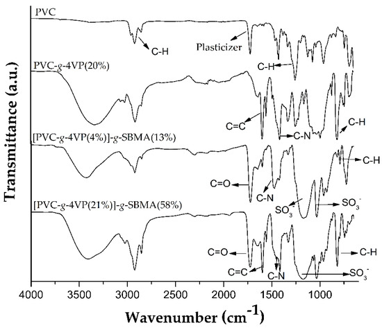 The PVC-g-4VP spectrum, apart from the previous bands, showed C=C stretching signals at 1597 and 1557 cm−1 and a band at 830 cm−1 from C-H bending out of the plane of the aromatic amine. Finally, the (PVC-g-4VP)-g-SBMA spectrum showed, in addition to all the above bands, bands at 1039 and 1265 cm−1 corresponding to the symmetric and asymmetric stretching of the sulfonate group (-SO3−), a band from the stretching of the carboxylic group at 1736 cm−1, and at 1440 cm−1 from the quaternary amine [35]. Higher SBMA grafted percentages presented the same bands but were more pronounced.