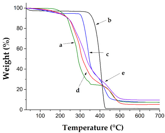 Thermograms (a) PVC, (b) 4VP homopolymer, (c) SBMA homopolymer, (d) PVC-g-4VP (12%), and (e) [PVC-g-4VP (12%)]-g-SBMA (25%).