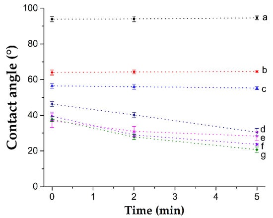 Dynamic contact angles for catheters (a) PVC, (b) PVC-g-4VP (4%), (c) PVC-g-4VP (12%), (d) [PVC-g-4VP (12%)]-g-SBMA (12%), (e) [PVC-g-4VP (4%)]-g-SBMA (13%), (f) [PVC-g-4VP (12%)]-g-SBMA (25%), and (g) [PVC-g-4VP (4%)]-g-SBMA (23%). Reported: the mean ± standard error of the mean, n = 4.