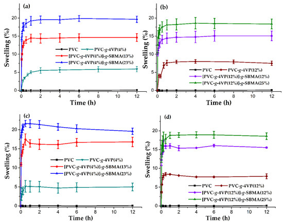 Figure 9c shows that the [PVC-g-4VP (4%)]-g-SBMA samples with 13 and 23% of SBMA grafting presented a singular behavior, with a maximum swelling at 30 min that later stabilized at 2 h, which was due to an ionic effect; in the case of samples with 12% 4VP, this percentage allowed higher stabilization. Finally, no significant difference was observed when comparing the swelling in water and PBS.