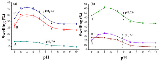 For the pH responsiveness test, buffer solutions of different pH (2, 3, 4, 5, 6, 8, 10, and 12) were prepared. The dry sample was weighed and swelled at 25 °C for 2 h in each pH solution. The swelling percentage was calculated with Equation (2) The critical pH and the pH-sensitivity determined the pH responsiveness; the former was estimated as the inflection point in the swelling (%) vs. pH curve; and the latter was calculated with the swelling ratios below and above the critical pH.