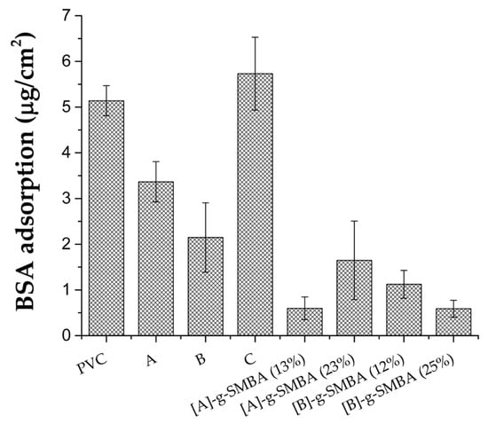 BSA adsorption on PVC catheters grafted with 4VP and SBMA; [A]: PVC-g-4VP (4%), [B]: PVC-g-4VP (12%), and [C]: PVC-g-4VP (21%). Reported: the mean ± standard error of the mean, n = 3.